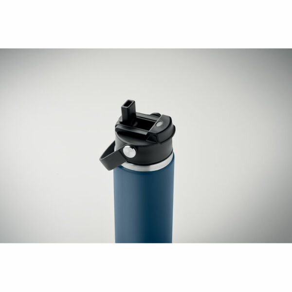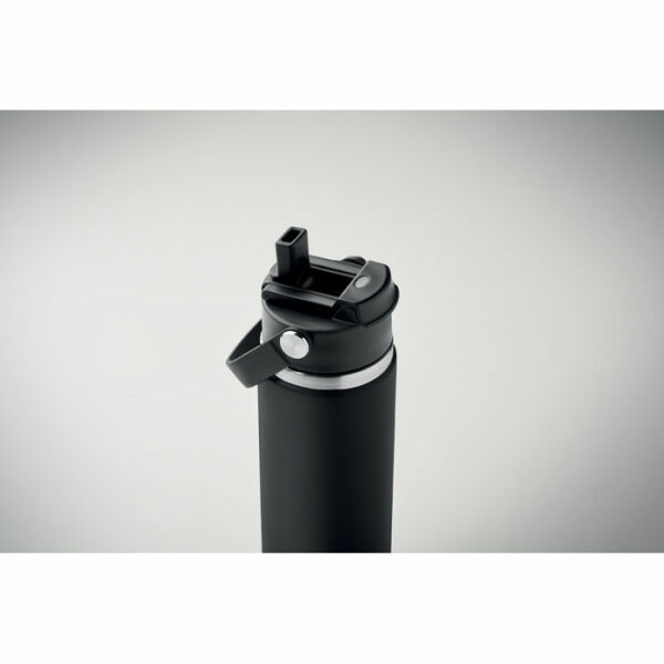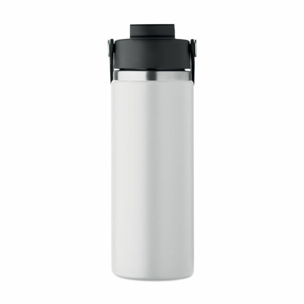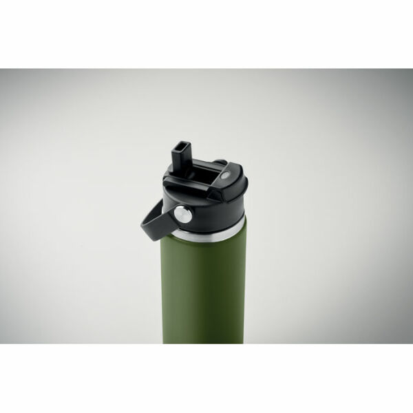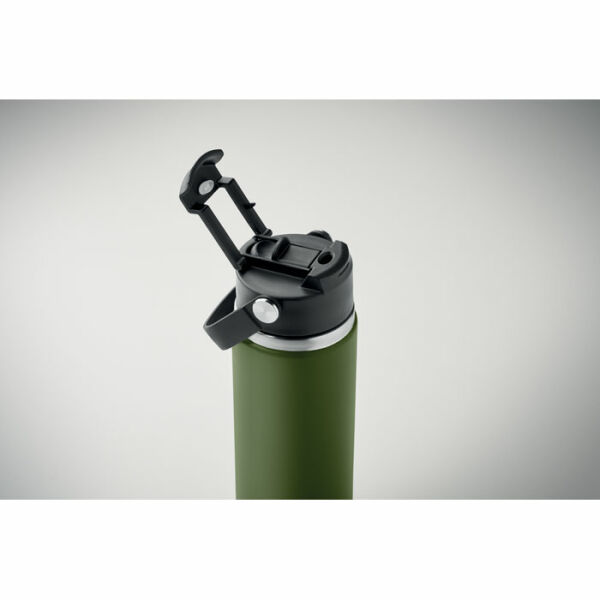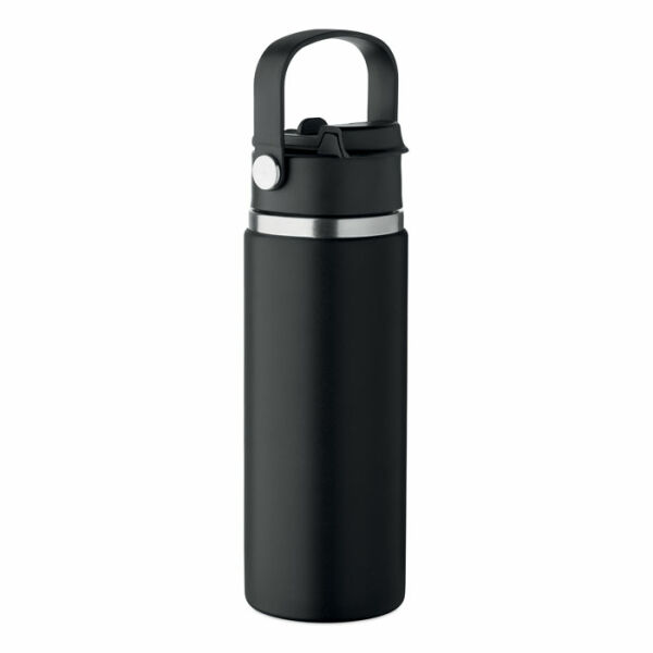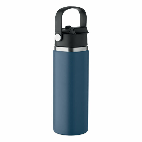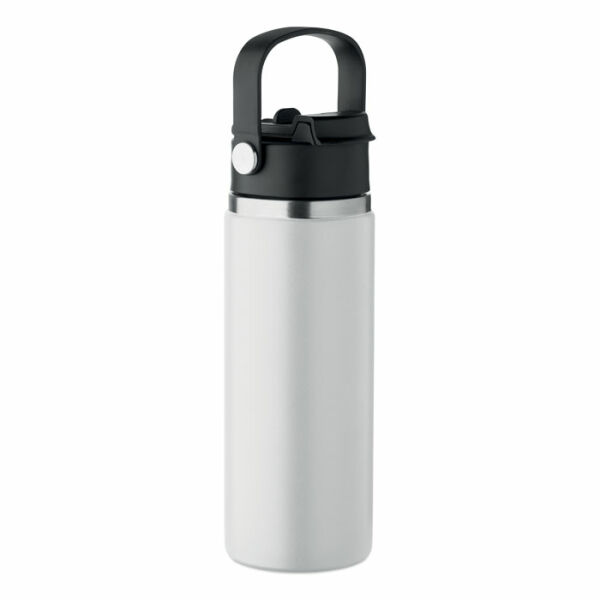 Dubbelwandige geïsoleerde fles van gerecycled roestvrij staal (90% gerecycled roestvrij en 10% roestvrij staal) met gecombineerd rietje en drinkdeksel met handvat. Lekvrij. Inhoud: 500ml.
